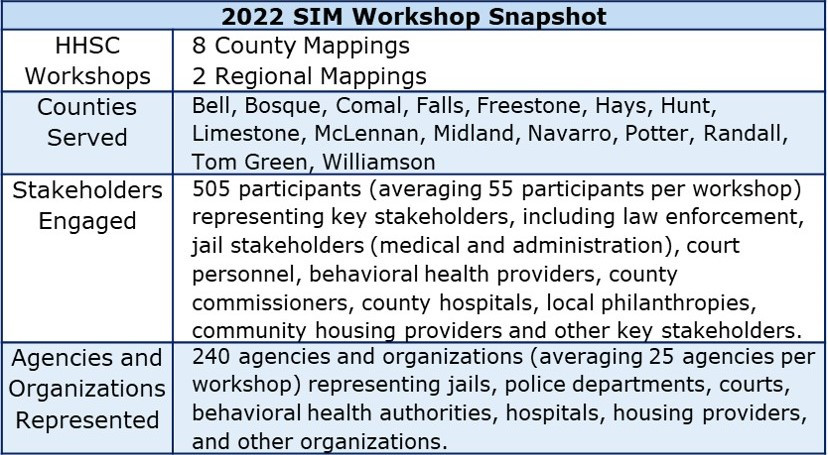 The Office of Forensic Coordination (OFC), on behalf of the Texas Health and Human Services Commission, has adopted the Sequential Intercept Model (SIM) as a strategic planning tool for the state and counties across Texas. In 2022, the OFC partnered with local behavioral health and justice system stakeholders to facilitate ten SIM Mapping workshops for 15 counties result in positive changes across the state.